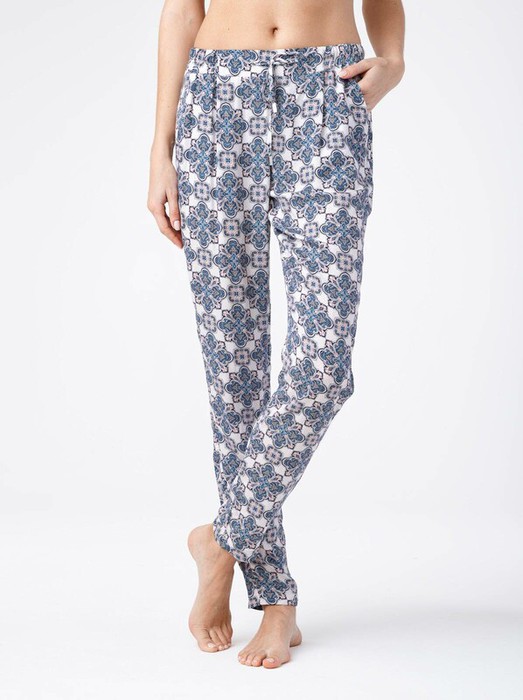 Брюки женские из набивного текстильного материала свободного покроя с карманами. Низ изделия обработан швом в подгибку. Верхний срез изделия обработан притачным поясом с резинкой по бокам и узкими завязками, вставленными по переду в люверсы.