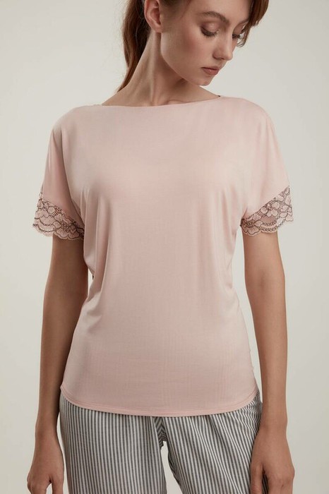 Цветочное кружево, подчеркнутое контрастной рельефной нитью, нежнейшая вискоза и умеренно прилегающая, комфортная посадка по фигуре – футболка Fusion создана для стильных и удобных домашних образов.