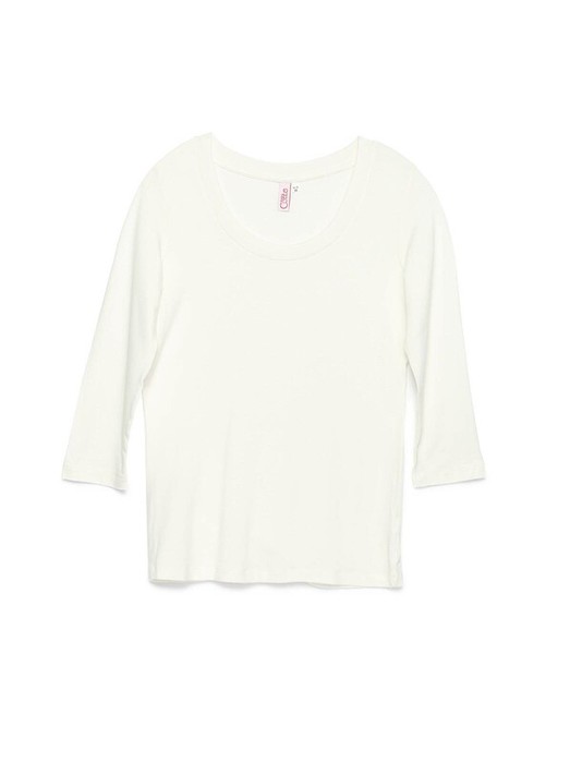 Джемпер женский из однотонного трикотажного полотна с втачным рукавом длиной 3/4. Круглая горловина изделия обработана планкой. По шву притачивания планки - отделочная строчка.