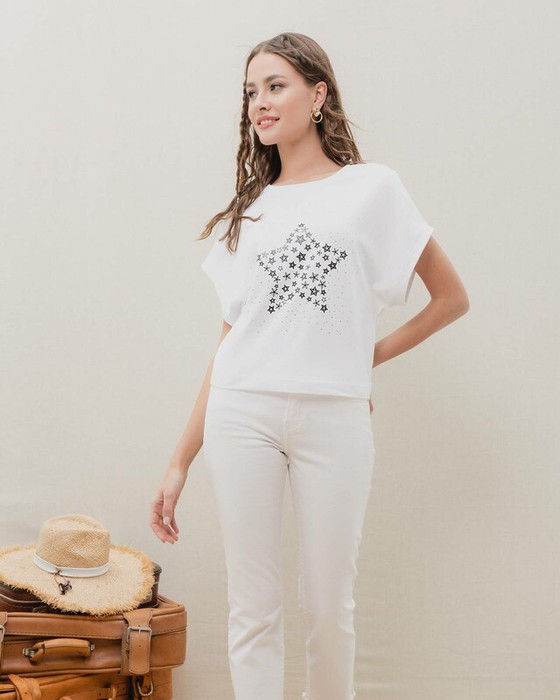 Хлопковая футболка в стиле oversize с приспущенным плечом и эффектным принтом с россыпью из стразов станет яркой изюминкой вашего летнего образа. В футболке будет легко и комфортно благодаря высокому содержанию хлопка в составе материала и свободному облеганию.