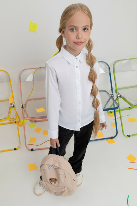 Классическая блузка для девочки с отложным воротником. Застегивается спереди на планку с пуговицами. Длинные втачанные рукава с манжетами регулируются по ширине.
