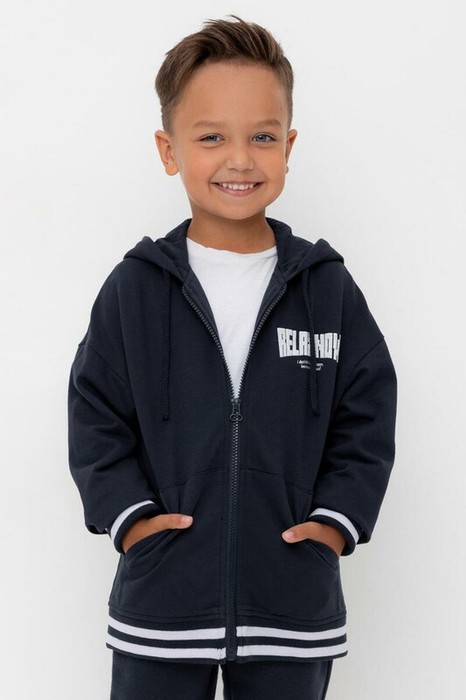 Толстовка с капюшоном для мальчика из мягкого трикотажа. В составе 80% натурального хлопка и 20% полиэстера, при этом полиэстер ввязан внутрь по особой технологии и не соприкасается с кожей. Воротник, манжеты и пояс - вязаные. Спереди два удобных накладных кармана.