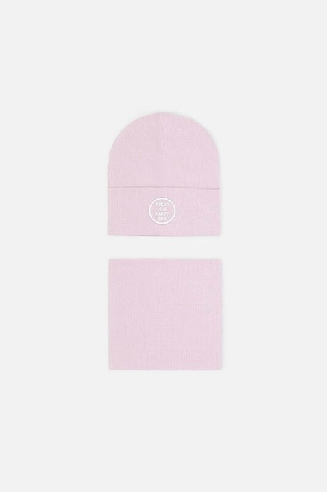 Комплект для девочки: шапка и снуд из хлопкового трикотажа в рубчик с добавлением эластана, окрашенного стойкими гипоаллергенными текстильными красителями. Изделия хорошо тянутся, после многократных стирок сохраняют цвет и форму.