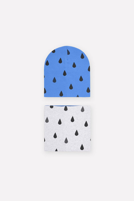 Комплект для мальчика - шапка и снуд из трикотажа рибана с эластаном. Шапка с удлинённой скругленной макушкой. Снуд сплошной, двусторонний. Украшены набивным рисунком с каплями.