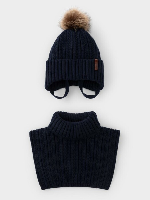 Комплект для мальчика: шапка и манишка из полушерстяной пряжи. Шапка на завязках с синтепоновым утеплителем. Подклад из натурального хлопка. Полностью закрывает голову, уши и шею, защищая ребёнка от холодного воздуха и ветра. На макушке помпон. Манишка с высоким воротником с эластичным отворотом.