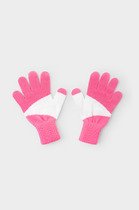 Вязаные перчатки из акриловой пряжи кораллового цвета с мягкими полосатыми манжетами. Широкие манжеты крепко фиксируют перчатку на руке.