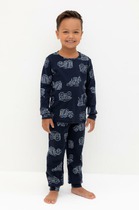 Трикотажный пижамный комплект из футера с начёсом, произведённого из натурального хлопка. У джемпера длинные рукава со спущенными плечами и эластичная мягкая горловина и манжеты. Брюки с удобным поясом на резинке, внизу манжеты. Оригинальная набивка выполнена из стойких, гипоаллергенных текстильных красителей. Все трикотажные полотна производятся в соответствии с нормами Швейцарского сертификата ЭкоТекс.