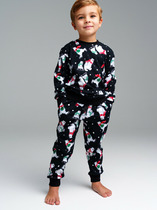 Новогодняя пижама из натурального хлопка.  Джемпер с длинными втачными рукавами и брюки с эластичной резинкой в поясе. Мягкие манжеты на рукавах и по низу брюк. Пижама отлично подойдёт для создания уютных домашних образов или в качестве подарка на Новый год и Рождество. Оригинальная набивка выполнена из стойких текстильных гипоаллергенных красителей. Изделие сохраняет цвет и форму после многократных стирок. Все трикотажные полотна производятся в соответствии с нормами швейцарского сертификата ЭкоТекс.