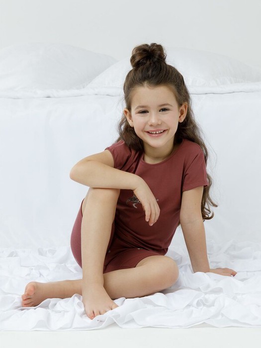 Трикотажная пижама для девочки с футболкой и велосипедками. Футболка с короткими рукавами изготовлена из гладкого трикотажа супрем. Велосипедки с резинкой в поясе выполнены из эластичного материала в рубчик. Оригинальная набивка и принт выполнены из стойких текстильных гипоаллергенных красителей. Изделие сохраняет цвет и форму после многократных стирок. Все трикотажные полотна производятся в соответствии с нормами швейцарского сертификата ЭкоТекс.