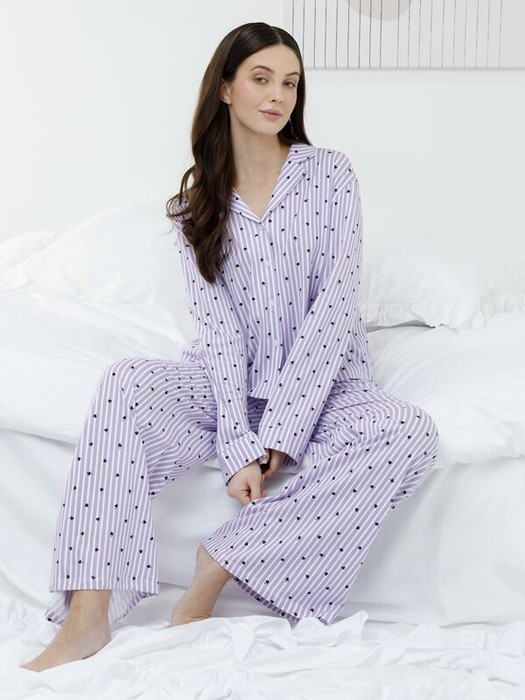Трикотажная пижама из натурального хлопка для комфортного сна и отдыха. Рубашка на пуговицах с длинными рукавами и широкие брюки с мягкой эластичной резинкой в поясе. Гладкий материал приятен к телу, не теряет форму и позволяет коже дышать. Набивной рисунок выполнен из стойких текстильных гипоаллергенных красителей. Все трикотажные полотна производятся в соответствии с нормами швейцарского сертификата ЭкоТекс.