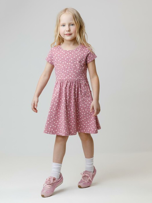Платье с короткими рукавами и удобными карманами для девочки. Изготовлено из высококачественного гладкого трикотажа, произведённого из натурального хлопка. Для удобства одевания в размерах 92 и 98 на плече платье застёгивается на кнопки. Изделие  сохраняет форму и стойкий цвет после многочисленных стирок и идеально подходит на каждый день. Все трикотажные полотна производятся в соответствии с нормами швейцарского сертификата ЭкоТекс.