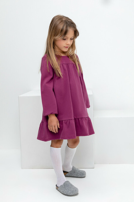 Платье с длинными рукавами из петельчатого футера. Изделие сохраняет цвет и форму после многократных стирок. Предусмотрена застежка на кнопки на спине.