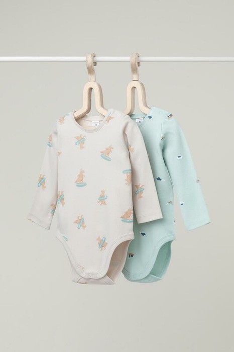 Боди для новорождённых из мягкого эластичного трикотажа, произведённого из натурального хлопка. В упаковке 2 штуки. Застёгиваются на кнопки на плече и по низу изделий. Оригинальная набивка выполнена из стойких гипоаллергенных текстильных красителей. Все трикотажные полотна производятся в соответствии с нормами Швейцарского сертификата ЭкоТекс.