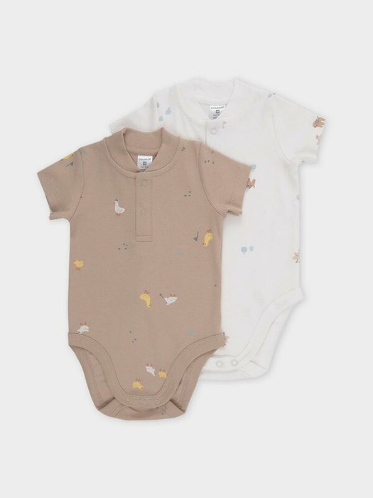 Боди для новорождённых из мягкого эластичного трикотажа, произведённого из натурального хлопка. В упаковке 2 штуки. Застёгиваются на кнопки спереди и по низу изделий. Оригинальная набивка выполнена из стойких гипоаллергенных текстильных красителей. Все трикотажные полотна производятся в соответствии с нормами Швейцарского сертификата ЭкоТекс.