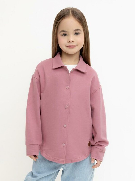 Свободная трикотажная рубашка для девочки из мягкого петельчатого футера. Застёгивается на кнопки. Модель с закругленным низом и спущенным плечом.