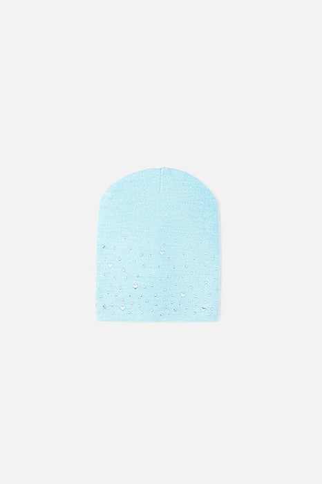 Шапка для девочки двухслойная из однотонной полушерстяной пряжи. Скругленная макушка. Нижняя часть украшена стразами.