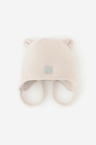 Белая шапка из полушерсти на завязках. Внутри - мягкая подкладка из трикотажа интерлок. Украшена вязаными заячьими ушками на макушке и стразами.