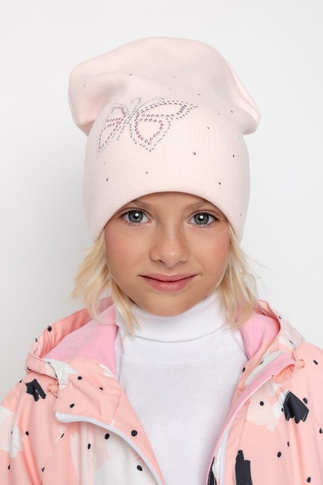 Шапка из акриловой пряжи персикового оттенка с внутренним отворотом. Украшена аппликацией из страз в форме бабочки.