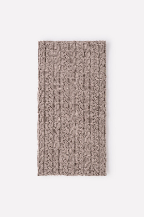 Однотонный снуд из полушерстяной пряжи для девочки, украшен вывязанными косами.