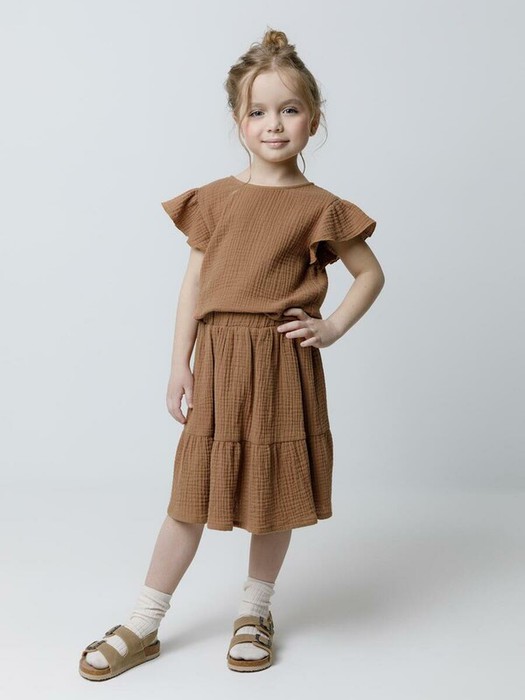 Легкая юбка для девочки из мягкого хлопкового муслина. По низу красивая оборка. Изделие сохраняет цвет, форму и фактуру жатости после многократных стирок.