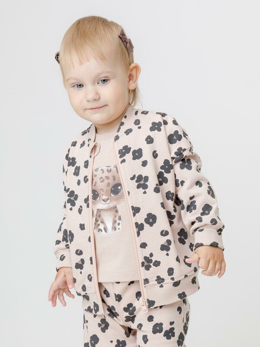 Мягкий бомбер на молнии для девочки. Изготовлен из высококачественного футера с начёсом. Воротник, манжеты и пояс выполнены из эластичного полотна. Оригинальный рисунок выполнен из стойких текстильных красителей. Бомбер сохраняет форму и стойкий цвет после многочисленных стирок. Все трикотажные полотна производятся в соответствии с нормами швейцарского сертификата ЭкоТекс.