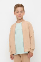 Бомбер для девочки с контрастными рукавами из мягкого трикотажа. В составе 80% натурального хлопка и 20% полиэстера, при этом полиэстер ввязан внутрь по особой технологии и не соприкасается с кожей. Застёгивается на кнопки. Воротник, манжеты и пояс вязаные. Спереди два кармана. Изделие сохраняет цвет и форму после многократных стирок. Все трикотажные полотна производятся в соответствии с нормами швейцарского сертификата ЭкоТекс.
