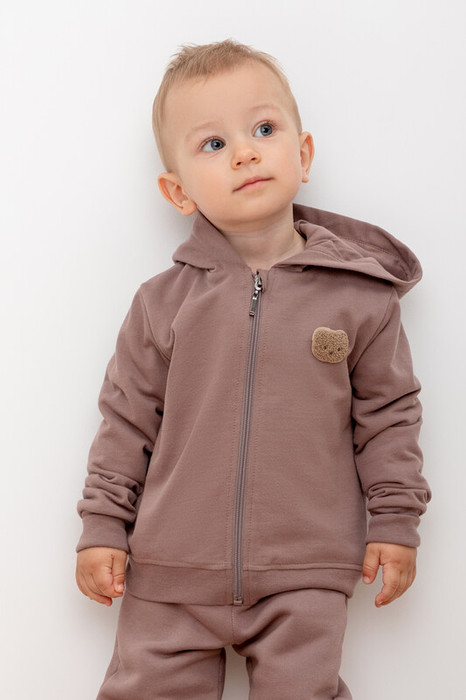Толстовка с капюшоном и декоративными ушками для мальчика из футера с начесом. В составе 80% натурального хлопка и 20% полиэстера, при этом полиэстер ввязан внутрь по особой технологии и не соприкасается с кожей. Манжеты и пояс из эластичного трикотажа. Спереди нашивка.