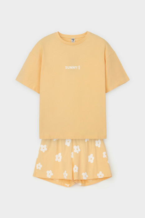 Трикотажный пижамный комплект из натурального хлопка. У футболки короткие рукава со спущенными плечами. Шорты с поясом на резинке. Оригинальная набивка выполнена из стойких, гипоаллергенных текстильных красителей. Все трикотажные полотна производятся в соответствии с нормами Швейцарского сертификата ЭкоТекс.