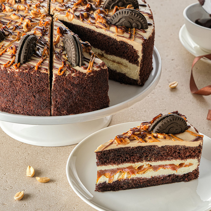 Торт на основе шоколадного бисквита и творожного-сырного крема с карамелью и жареным арахисом. Украшен шоколадным печеньем с кремовой прослойкой.