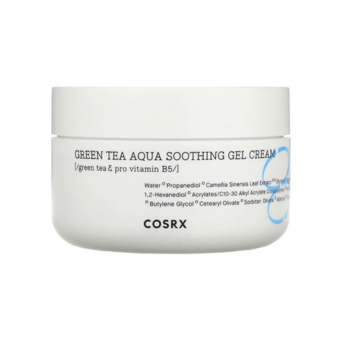 Срок годности до 09.07.2027Успокаивающий гель-крем с зелёным чаем COSRXGreen Tea Aqua Soothing Gel Cream эффективно снимает красноту и зуд, обладает лёгким охлаждающим действием и отлично освежает кожу. Гель-крем легко распределяется по коже, быстро впитывается, не оставляя липкости и жирного блеска. Отлично подходит для чувствительной и склонной к жирности кожи.Основные действующие компоненты:Провитамин В5 (Д-пантенол) помогает в лечении различных кожных заболеваний, стимулирует обновление кожи, обладает сильном противовоспалительным действием, восстанавливает и глубоко питает.Экстракт листьев зелёного чая обладает выраженными антисептическими и антибактериальными свойствами, успокаивает и заживляет поврежденную кожу, нормализует обменные процессы в тканях, способствует очищению кожи и сужению пор, улучшению цвета лица. Экстракт листьев  алоэ способствует смягчению кожи и снятию раздражений, ускоряет заживление ранок, обладает противовоспалительной и антиаллергической активностью, оказывает антиоксидантное воздействие, стимулирует синтез собственных коллагеновых волокон.Аллантоин смягчает, интенсивно увлажняет кожу, способствует сужению пор и нормализации выработки кожного сала, обладает противовоспалительными свойствами, успокаивает раздраженную кожу.Гидролизованный экстракт гибискуса увлажняет и оказывает антиоксидантное действие, препятствует старению, способствует глубокому очищению кожи от омертвевших клеток и сужению пор.Рекомендуется для чувствительной, комбинированной и жирной кожи.Способ применения: завершающим этапом ухода нанесите необходимое количество крема лёгкими похлопывающими движениями.Объем: 50 мл