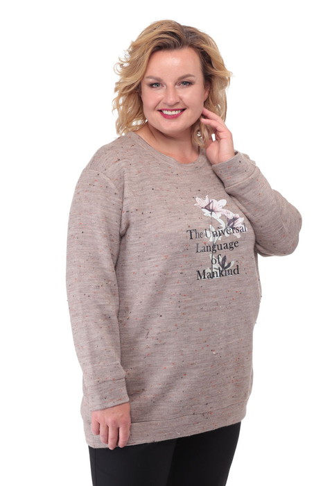 Удлиненный джемпер из трикотажной ткани с начесом,очень теплый. Плечо слегка спущенное, горловина округлой формы. Перед и спинка цельные,с притачной планкой по низу, по переду клеевая апликация. Рукав втачной, одношовный, с притачной манжетой. Длина по спинке 74 см, длина рукава от горловины 73 см, длина рукава от плечевого шва 55 см.