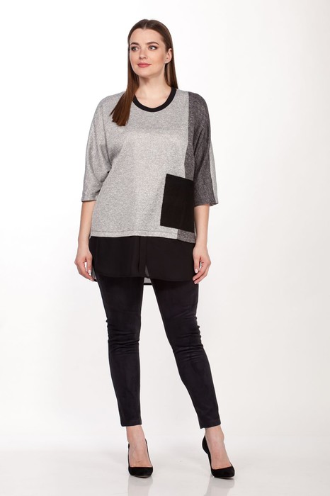 Туника женская полуприлегающего силуэта, выполнена из трикотажа с добавлением спандекса, с цельнокроеным рукавом. Полочка и рукав украшены сеткой на контрасте с основной тканью изделия. На полочке выполнен накладной карман из ткани контрастного цвета, по переду и спинке пришита отделка из тонкой полупрозрачной ткани. Длина туники по спинке 82 см.