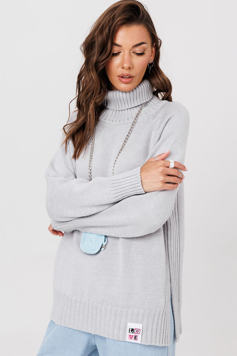 Джемпер удлинённый трикотажный вязанный с длинным рукавом-реглан. По переу нашивка «LOVE».  Внизу по боковым швам разрезы. Горловина - стойка с отворотам, по краю которого  нашивка «BUTER».