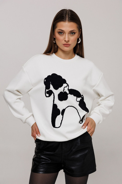 Джемпер из технологичного трикотажного полотна с эффектом peach. Прямого силуэта с втачным рукавом и спущенной линией плеча, с манжетой из отделочной ткани по низу рукава. По переду вышивка "Лошадка". По горловине и низу изделия притачная планка из отделочной ткани.
