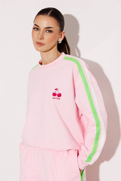 Джемпер трикотажный прямого силуэта с втачным рукавом и спущенной линией плеча, с манжетой по низу рукава. По плечу и рукаву вставка с 2-мя настроченными лампасами. Полочка с печатью "Cherry". По горловине притачная планка. В подгибку низа втянут шнурок благодаря чему изделие можно затянуть.