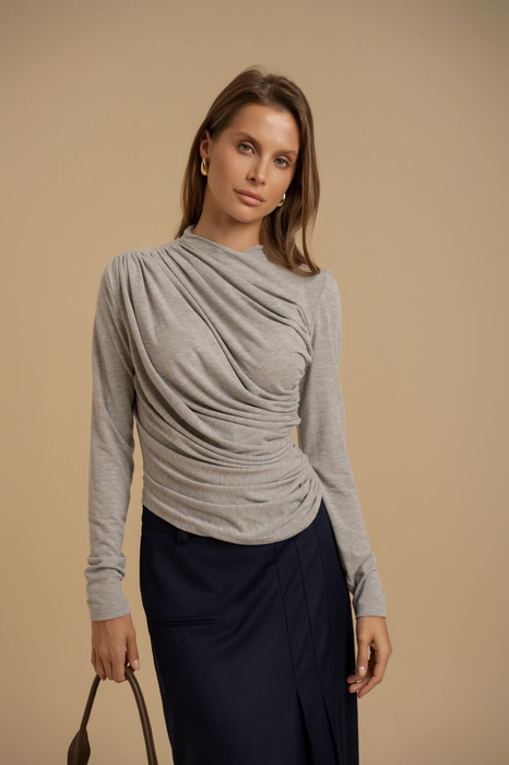 Джемпер женский облегающего силуэта из эластичного трикотажного полотна. Вырез горловины - неглубокий. Рукава - втачные. Изделие декорировано ассиметричной драпировкой.