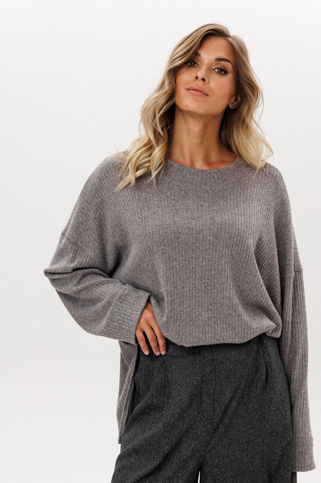 Джемпер выполнен из трикотажного полотна в рубчик. Джемпер прямого силуэта , покроя "oversize" длиной ниже линии бедер. Перед и спинка цельные. Горловина округлой формы, обработана широкой бейкой. Плечевой шов удлинен. Рукав рубашечного покроя, одношовный. В боковых швах разрезы.