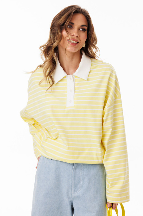 Джемпер выполнен из трикотажного полотна в полоску. Джемпер прямого силуэта, покроя oversize. Длиной до линии бедер. По переду обработана застежка на планке от горловины до линии груди. Горловина округлой формы, обработана воротником рубашечной формы. Плечевой шов удлинен. Рукав рубашечного покроя, одношовный. Планки и воротник выполнены из однотонного трикотажного полотна.