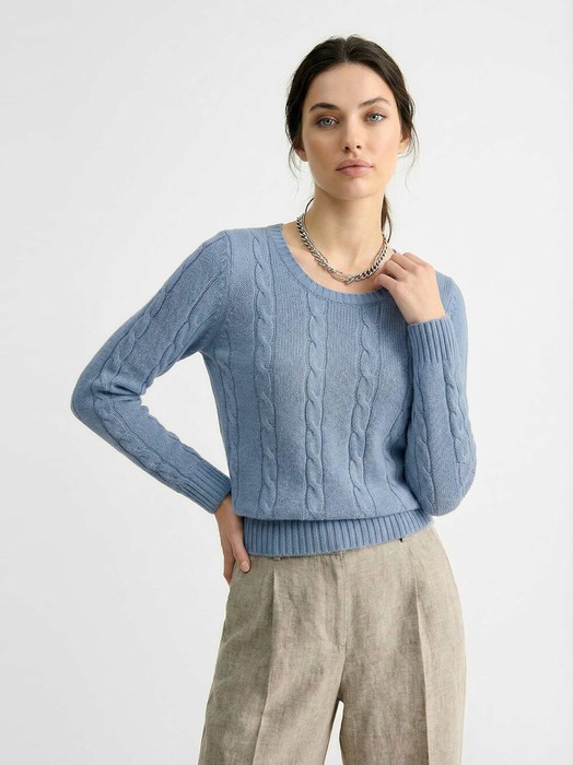 Вязаный джемпер с косами. Силуэт изделия прямой с круглой горловиной и длинным рукавом прямого покроя.