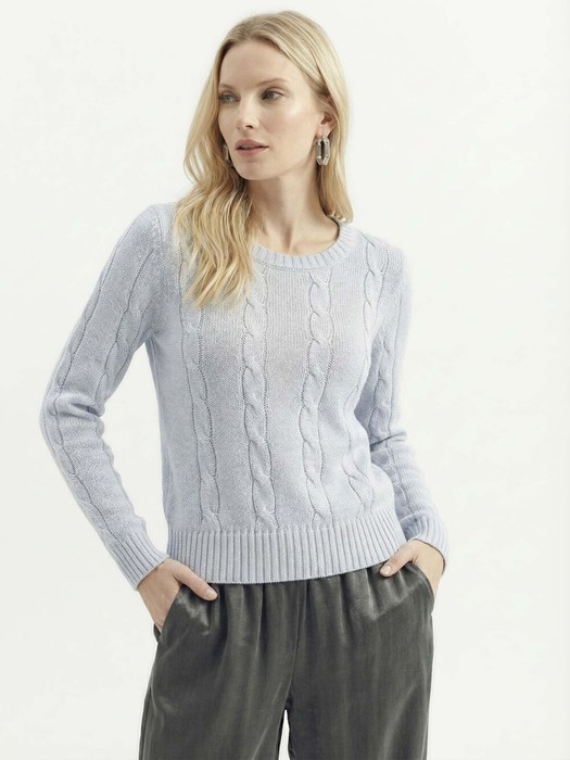 Вязаный джемпер с косами. Силуэт изделия прямой с круглой горловиной и длинным рукавом прямого покроя.