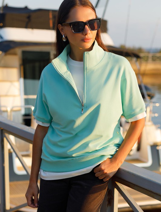 Состав: 95%Хлопок 5%ПУ Плотность: 240 Г/м2 Параметры модели на первом фото: Рост 170, бюст 83, талия 64, бедра 88Джемпер среднего объема со спущенным плечом выполнен из футера двухнитки с эластаном. Изделие с воротом на серебристой молнии дополнено боковыми карманами. Эластичный материал гарантирует комфорт и формоустойчивость. Сочетается в костюме с брюками D44.138, D44.139 и шортами D48.008. Изделие дополнено металлическим логотипом бренда.