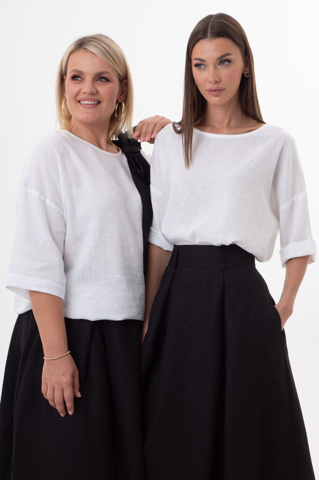 Свободный крой джемпера с круглым вырезом и слегка удлиненной линией подола гарантирует универсальность. Его можно сочетать с брюками, шортами, юбками или носить как платье с поясом. Натуральная текстура льна с добавлением вискозы делает ткань гипоаллергенной и дышащей.