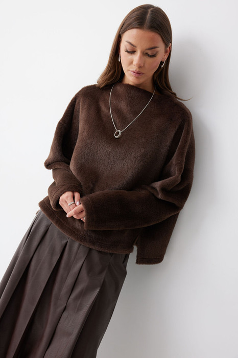 Джемпер прямого силуэта из трикотажного полотна с фигурным низом. Горловина цельнокроеная стойка. Рукав со спущенной линией плеча, удлиненный. Джемпер со смещенным боковым швом.