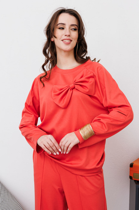 Джемпер свободного силуэта с округлой горловиной. Рукав комбинированного кроя, с передними и задними швами. Верхняя и нижняя часть рукава образуют между собой разрез. Карманы в боковых швах. По переду изделие декорировано фигурным бантом.