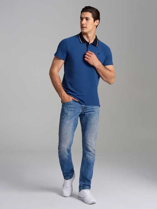 Футболка-поло из хлопкового полотна "пике". Классическая модель поло с короткими рукавами. Воротник и манжеты рукава выполнены из трикотажной рибаны темно-синего цвета с белой полосой. На полочке застежка-планка на пуговицах. На полочке вышивка "R". По низу футболки в боковых швах выполнены разрезы, обработанные тесьмой.