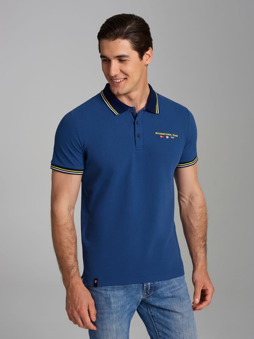 Футболка-поло из хлопкового полотна "пике". Классическая модель поло с короткими рукавами. Воротник и манжеты рукава выполнены из трикотажной рибаны темно-синего цвета с бело-желтой полосой. На полочке застежка-планка на пуговицах. На нижней планке и по горловине настрочена контрастная киперная тесьма. На полочке выполнена вышивка "INTERNATIONAL TEAM" и вышивка флагов. По низу футболки в боковых швах выполнены разрезы, обработанные тесьмой. С правой стороны полочки, по низу настрочен жаккардовый "флажок" с логотипом.
