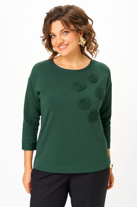 Джемпер женский из трикотажной хлопковой ткани (двунитка). По переду джемпера расположены декоративные элементы. Спущенное плечо, рукав 3/4. Низ рукава обработан манжетой. Вырез горловины круглый, оформлен бейкой.