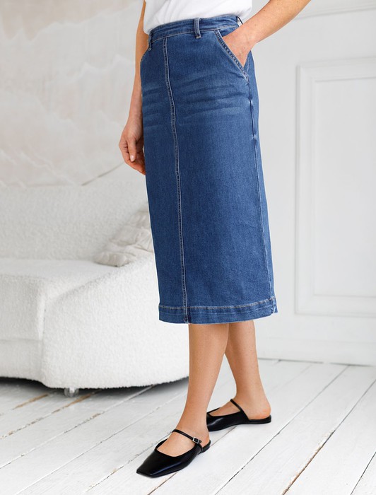 АКЦИЯ 8 марта! Джинсовая юбка прямая с разрезом и декоративной стиркой из элас