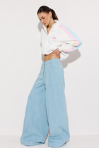 Брюки-джинсы, расклешенные к низу. На притачном поясе со шлёвками, застежкой-гульфик. Пояс застегивается на петлю-пуговицу. По переду карманы. Спинка с кокеткой и накладными карманами. По шаговому шву клин из основной ткани, переходящий на перед и спинку.