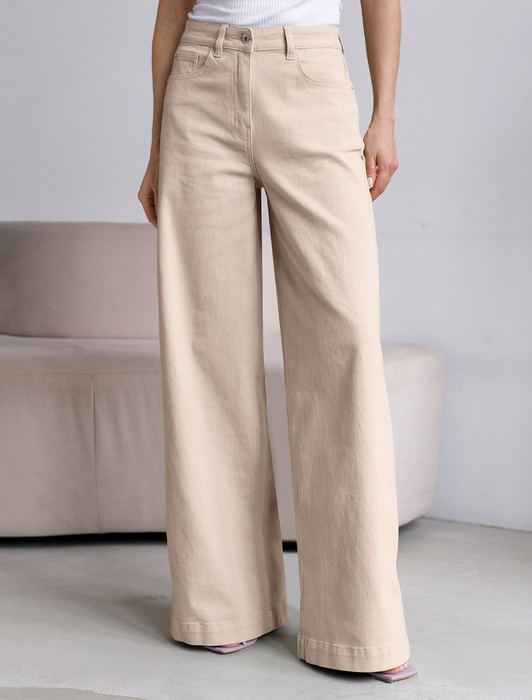 Состав: 98%Хлопок 2%ПУ Плотность: 10.6 OZ Параметры модели на первом фото: Рост 172, бюст 88, талия 64, бедра 88Джинсы-трубы выполнены из мягкого хлопкового денима с эластаном. Модель свободного кроя с посадкой на талии визуально вытягивает силуэт и подчеркивает достоинства. Отлично впишется в расслабленные летние образы. Наличие эластана в составе способствует формустойчивости и комфортной носке. Изделие дополнено брендированным патчем из эко-кожи и сочетается в костюме с курткой D51.033